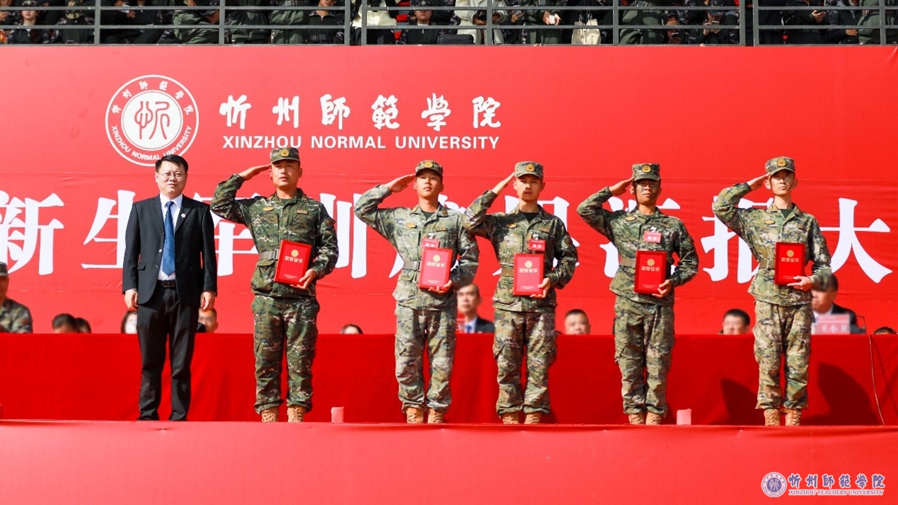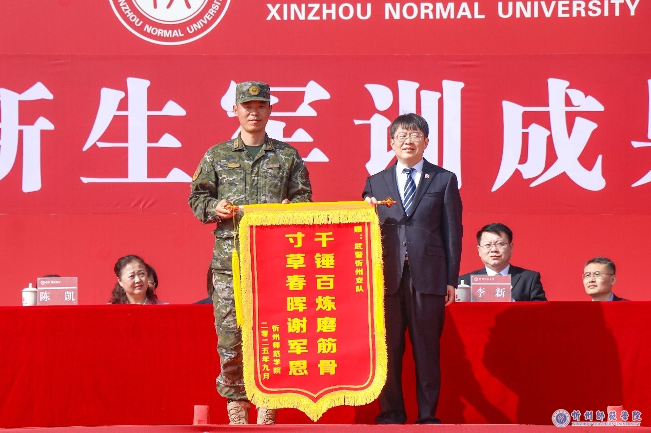 校长李新为新生军训优秀教官颁发荣誉证书,感谢他们在烈日骄阳下率先垂范,将人民武警的优良作风和家国情怀深植于忻师学子心中,为2025级新生上了精彩的大学第一课。