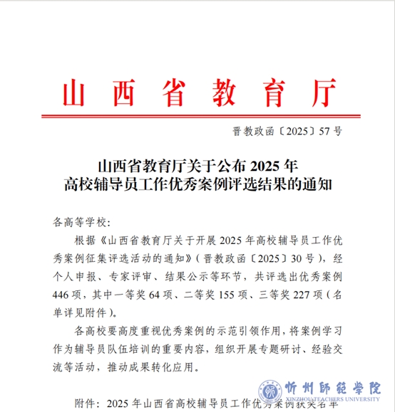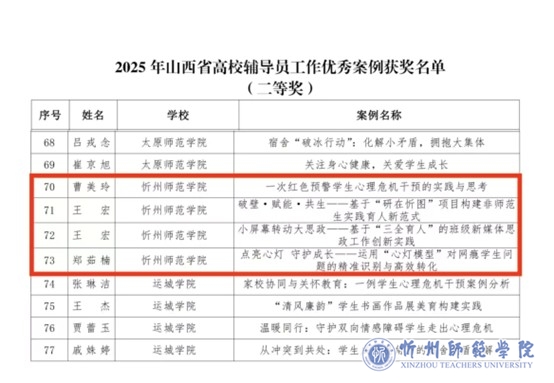 近日,省教育厅公布了2025年山西省高校辅导员工作优秀案例评选结果。我校辅导员曹美玲、王宏、郑茹楠在优秀案例评选中载誉而归,凭借在长期工作中积淀的扎实育人功底与创新工作方法,所选送案例全部获得二等奖的优异成绩。
