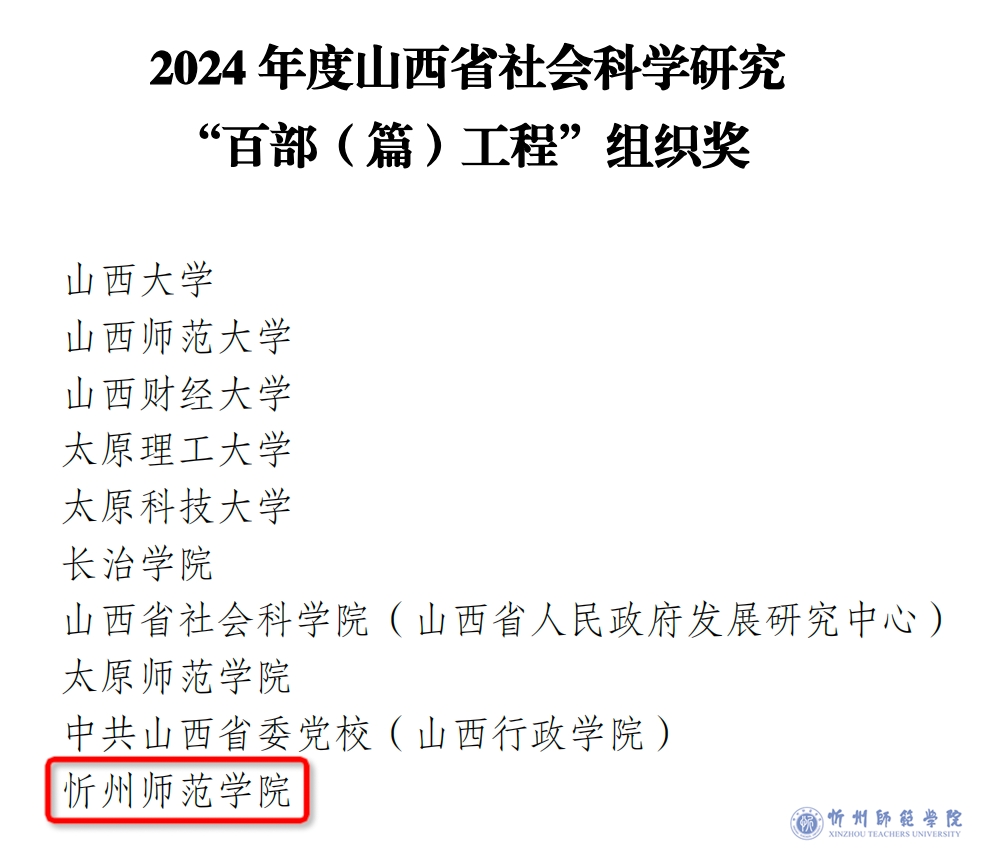 近日,山西省社会科学界联合会公布了《关于表彰2024年度山西省社会科学研究优秀成果“百部(篇)工程”优秀成果及先进组织单位的决定》,我校被表彰为 “先进组织单位”,我校经济管理系博士康文梅、科研部部长曹建芳分别获二等奖、三等奖。