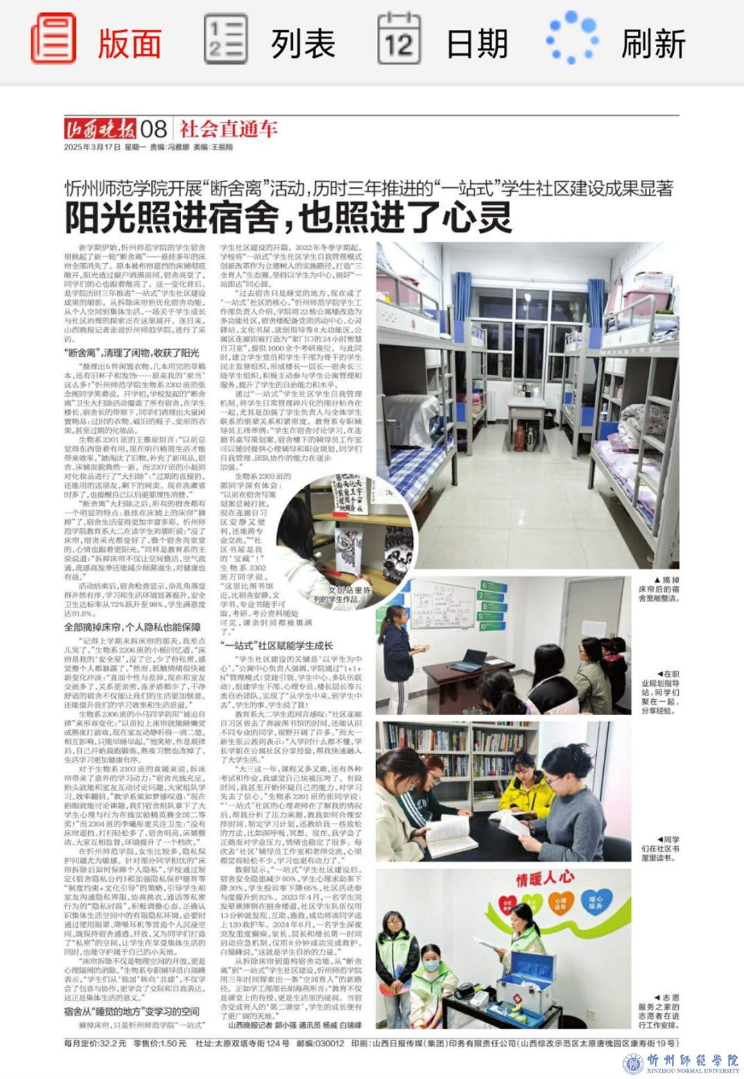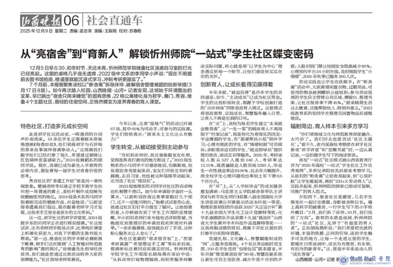 近日,《山西晚报》以《从“亮宿舍”到“育新人”解锁忻州师院“一站式”学生社区蝶变密码》为题,对我校“一站式”学生社区建设成果进行了第二次跟踪报道,全面展现了学校以学生为中心、深化育人模式改革的实践成效。