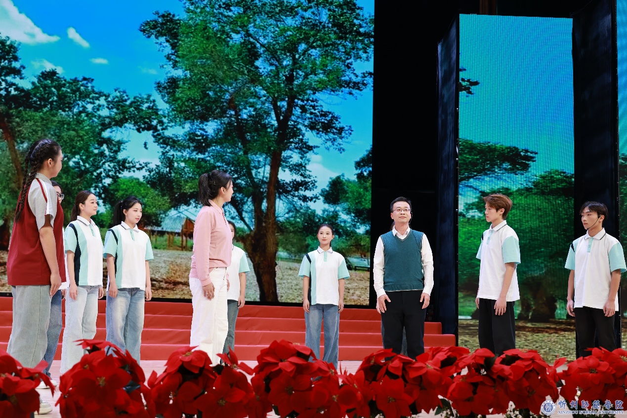 第一篇章“致敬奋斗”,聚焦平凡中的伟大与坚守,以多元艺术汇就了一部深沉而充满力量的校园史诗。歌曲《我把忻师比故乡》以质朴悠扬的旋律,唱出了学子对母校的深深眷恋,唤起了跨越届别的集体记忆。取材于真实西部支教故事的微话剧《胡杨树下的约定》,深情演绎了忻师人扎根边疆、播种希望的动人情怀,现场观众无不动容。走得再远,也不能忘记过去,不能忘记为什么出发。朗诵《我们是谁》以金石般的铿锵之声叩问初心,深刻诠释了忻师教育工作者和青年学子将个人理想融入强国伟业的的使命担当。男女对唱《为了谁》则将军民鱼水情巧妙转化为师生同心、共筑梦想的深厚情谊。歌曲串烧《春风雨露》《花好月圆夜》等,以悠扬的旋律与和谐的意境,赞颂了校园内外因奋斗而生的欣欣向荣与岁月静好。
