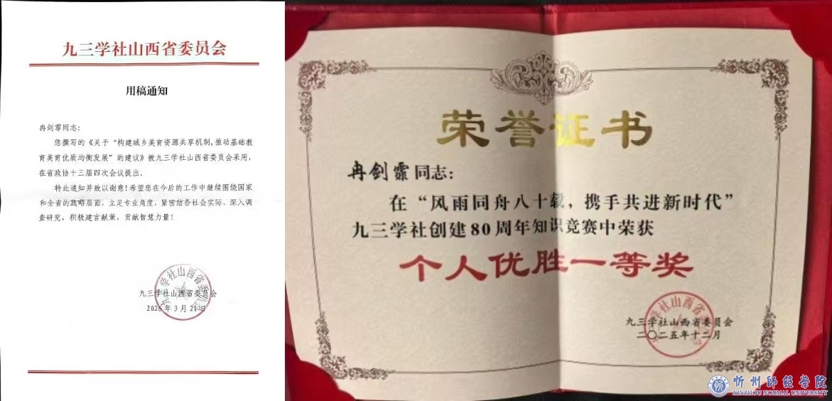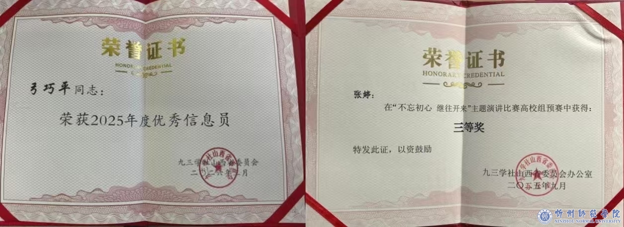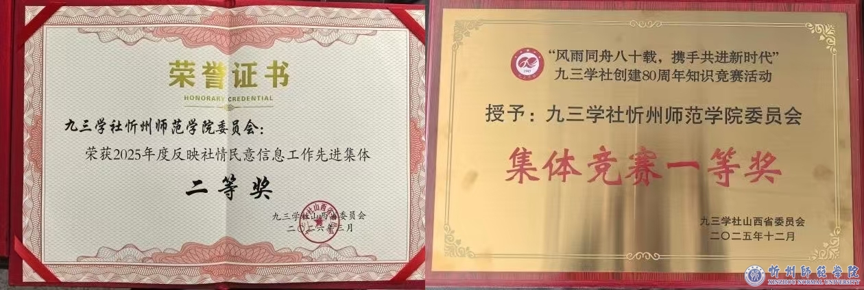 近日,九三学社忻州师范学院委员会在多项评选与赛事中捷报频传,充分展现了我校民主党派成员的良好风貌与责任担当。